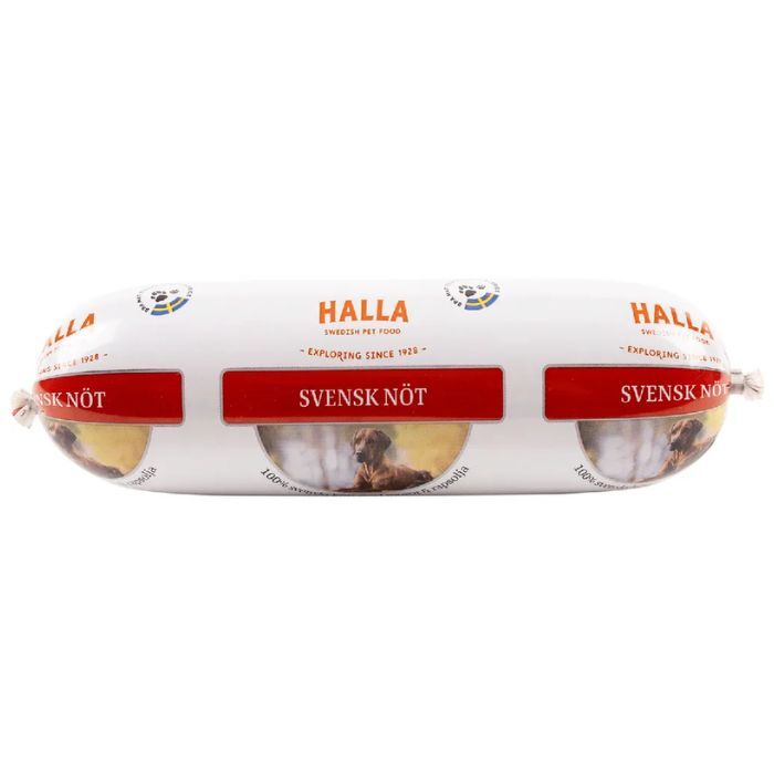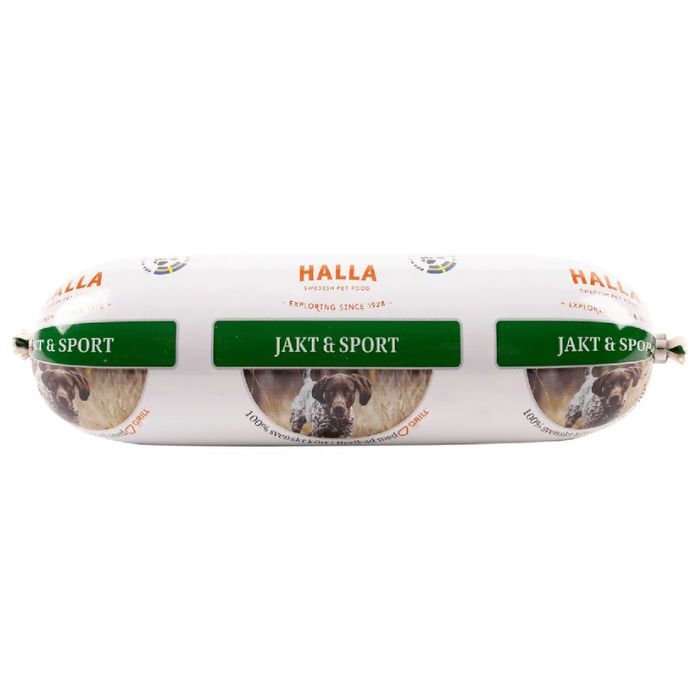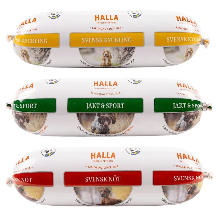 Halla vådfoder 650 g fås i tre naturlige varianter: kylling, oksekød og Jagt & Sport. Fuldfoder uden tilsætningsstoffer – med svenske råvarer, glucosamin, omega-3 og god smag. Perfekt som hovedmåltid eller smagfuld topping.