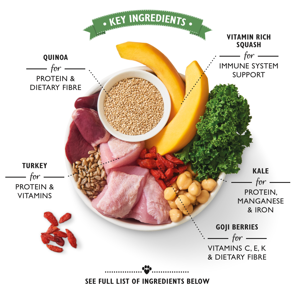 50% Frisklavet Kalkun, Squash (8%), Grønkål (4%), Gojibær (1%), Tranebær, Kikærter, Quinoa, Mineraler, Solsikkefrø, Persille, Mynte
